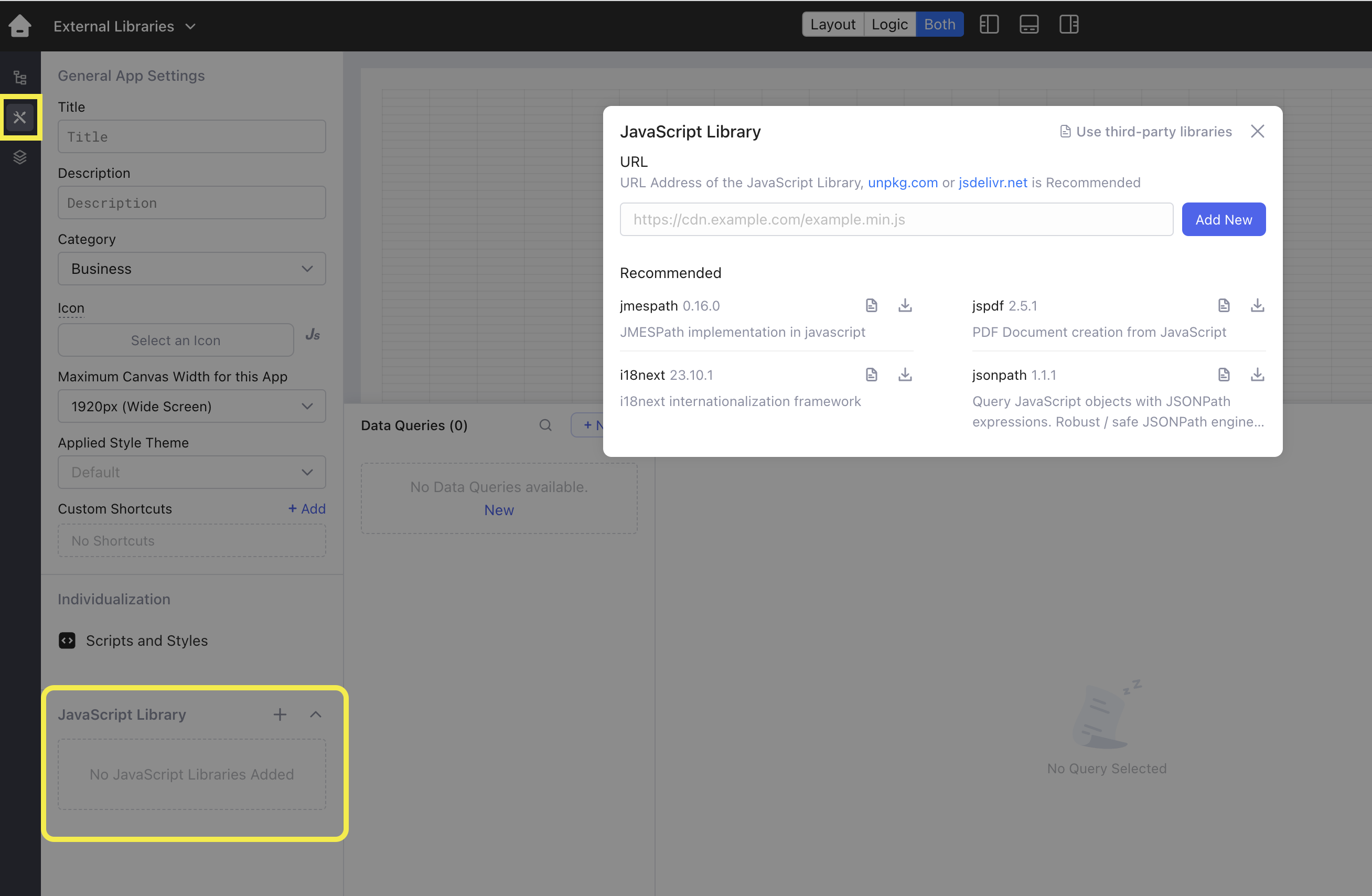 Go to [Lowcoder's homepage](https://www.lowcoder.cloud/), select **Settings** > **Advanced**, and click **Add** under the **JavaScript library** tab. Paste the link of the third-party JS library and click **Add New** to add it to your workspace. You can also click the download icon to add any recommended JS library quickly. The installed libraries are accessible from any app within your workspace.