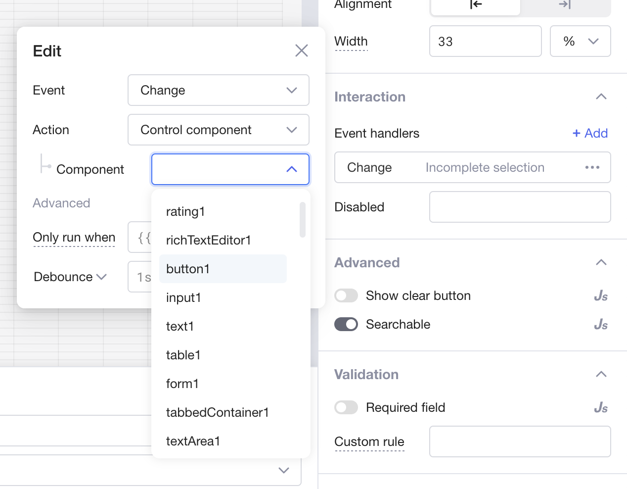 One of the powerful concepts of Lowcoder are the Event handlers. Based on User interaction almost every Component can release Events, on which you can react with different actions.