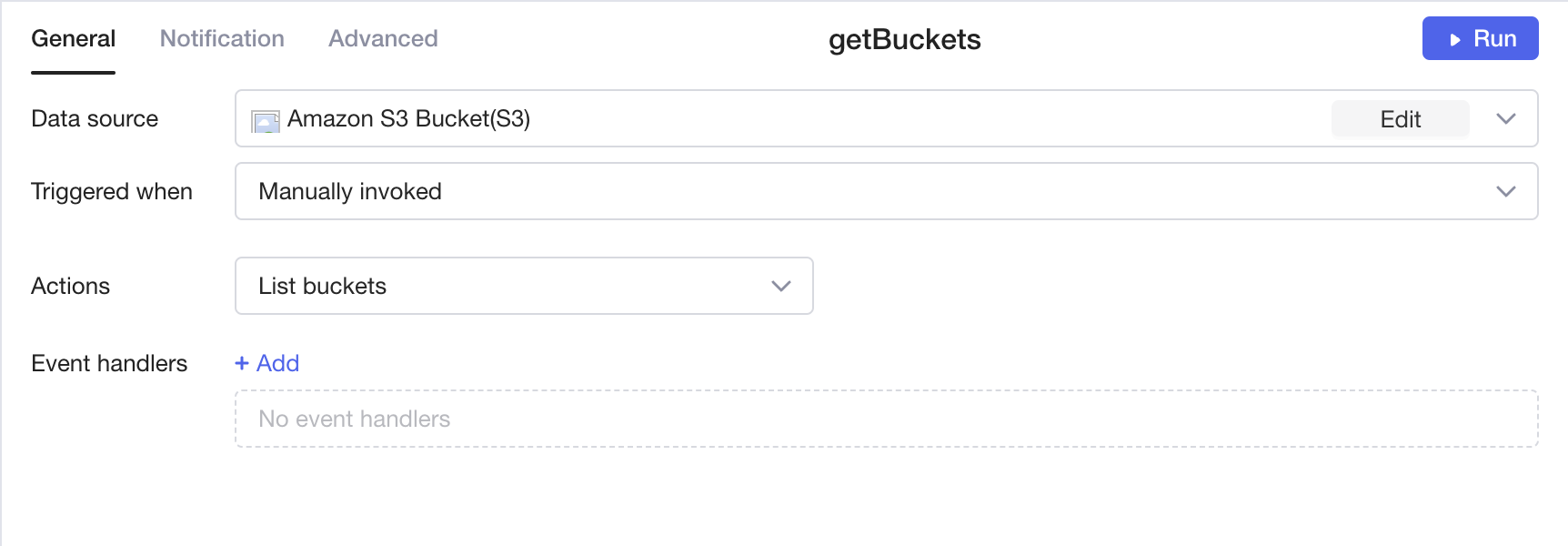Choose "List Buckets" to get a JSON List of your S3 Buckets.